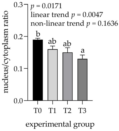 Nucleus to cytoplasm ratio measured in parotid glands. Groups were fed with a standard mixture (T0; control group), or the standard mixture supplemented with 1% (T1), 2% (T2), or 3% (T3) tannin-rich extract Farmatan®. a,b Different superscript letters indicate significant differences (p < 0.05).