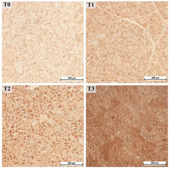Immunohistochemical staining with antibodies against acid proline-rich proteins (PRH1/2) in the parotid gland, 40× magnification. Groups were fed with the standard mixture (T0; control group) or standard mixture supplemented with 1% (T1), 2% (T2), or 3% (T3) tannin-rich extract Farmatan®.