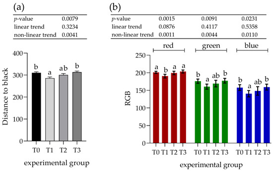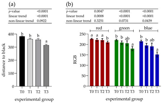 Assessment of immunohistochemical staining with antibodies against basic proline-rich proteins (PRB2) in the parotid salivary gland. (a) Distance to black; (b) RGB channel (red, green, blue). Groups were fed with the standard mixture (T0; control group) or standard mixture supplemented with 1% (T1), 2% (T2), or 3% (T3) tannin-rich extract Farmatan®. Values represent mean ± SEM for each channel. a,b Different superscript letters indicate significant differences (p < 0.05).
