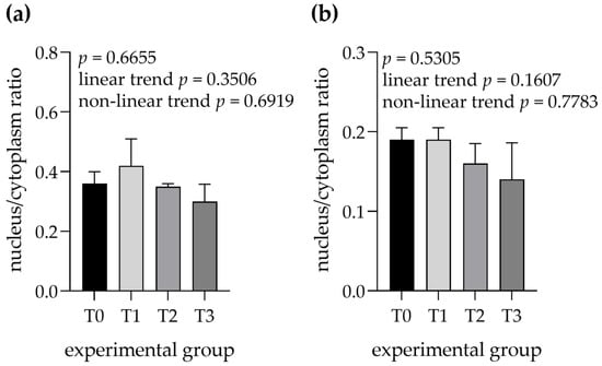 No differences were observed for the nucleus to cytoplasm ratios of serous cells (linear trend = 0.3506, nonlinear trend = 0.6919) and mucous cells (linear trend = 0.1607, nonlinear trend = 0.7783) between the experimental groups (Figure 8).