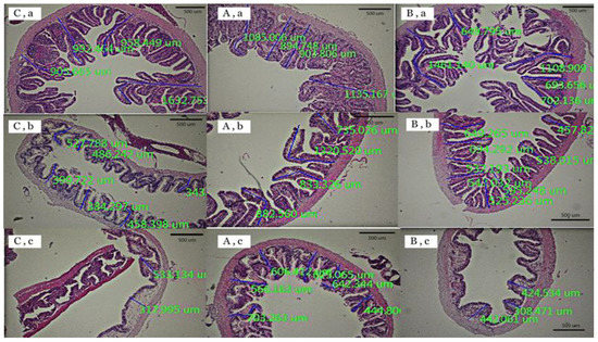 Histology slides of the anterior part (a), the middle part (b), and the posterior part (c) of the intestines of red tilapia that were fed with different organic trace mineral supplementations: control (C), T1 (A), and T2 (B).