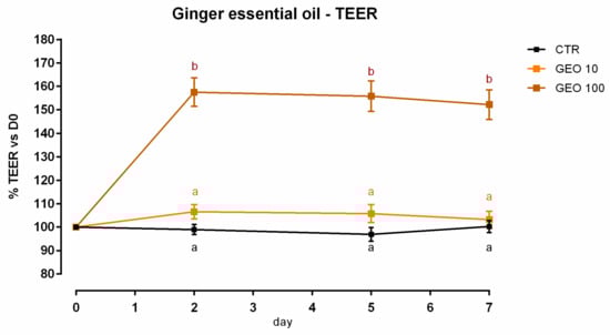 TEER of Caco-2 cells cultured with 10 or 100 ppm of ginger essential oil. Data in the graph are represented as means (n = 6) ± SEM. Different letters indicate statistical significance with p < 0.05. GEO = ginger essential oil, TEER = transepithelial electrical resistance (Ω·cm2).