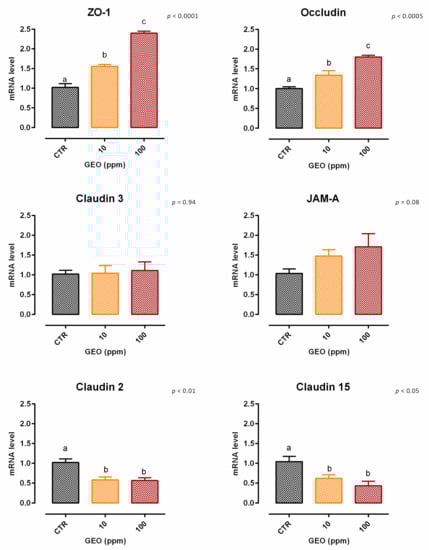 A slight but significant reduction (about 9%) in viability was reported with 100 ppm of GEO after 7 days of treatment (Figure S1). Concerning TEER, 100 ppm of GEO significantly increased the electrical resistance starting from day 2, and the increment remained significant during the entire study, compared to the control and the other inclusion (Figure 1). Results regarding gene expression are consistent with TEER, as reported in Figure 2. Compared to the control, mRNA levels of ZO-1 and occludin were significantly improved by the treatments in a dose-response manner (p < 0.0005). Additionally, JAM-A was tendentially increased by the treatments (p = 0.08). Conversely, both claudin 2 and claudin 15 mRNA levels were significantly reduced by the addition of GEO, with a stronger reduction with 100 ppm of inclusion (p < 0.05). No differences were reported for claudin 3.