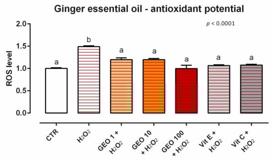 After 24 h of incubation, GEO did not induce ROS production for any of the concentrations tested (data not shown). Moreover, when cells were challenged with H2O2 for 60 min (ROS-production challenge, positive control), all of the treatments with GEO allowed for a significant reduction of ROS concentration compared to the positive control, maintaining the same level of ROS as the unchallenged group and vitamins (internal controls) (Figure 3).