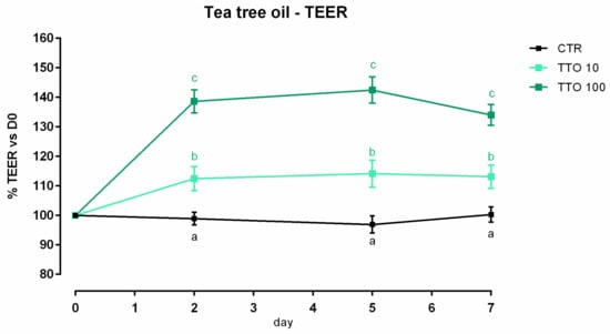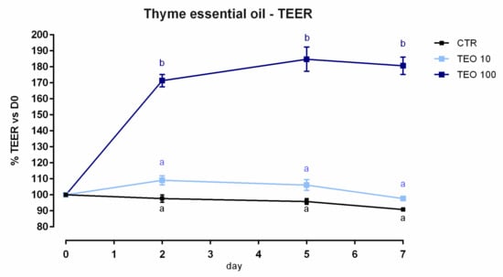 TEER of Caco-2 cells cultured with 10 or 100 ppm of tea tree oil. Data in the graph are represented as means (n = 6) ± SEM. Different letters indicate statistical significance with p < 0.05. TEER = transepithelial electrical resistance (Ω·cm2).