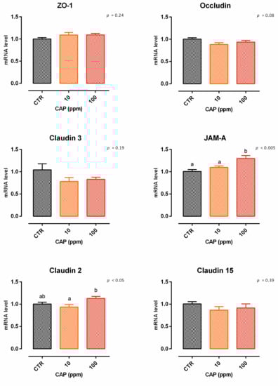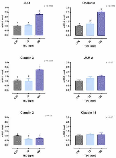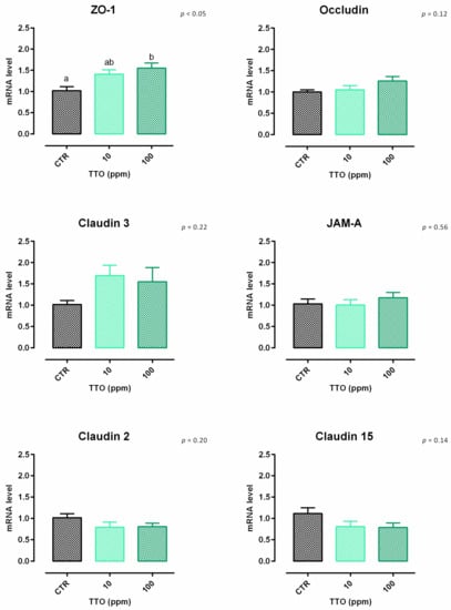 After 7 days, a significant reduction of viability was reported, starting from 200 ppm of inclusion (Figure S2). Concerning the dose response, both 10 and 100 ppm of TTO positively impacted the TEER immediately after the start of the treatment, and the increment remained constant throughout the entire study in a dose-dependent manner, compared to the control (Figure 4). Results regarding gene expression are reported in Figure 5. Compared to the control, the mRNA level of ZO-1 was significantly enhanced by the supplementation of 100 ppm of TTO (p < 0.05). No differences were reported for occludin, JAM-A, claudin 2, claudin 3, or claudin 15.
