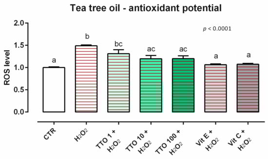 Effects of tea tree oil on intracellular ROS production: ROS level of Caco-2 cells treated with 1, 10, or 100 ppm of TTO and challenged with 500 μM of hydrogen peroxide (H2O2) for 60 min. ROS production was assessed by CellROX® deep red reagent assay and expressed as fluorescence intensity calculated relative to the control group. Values in the graph are means (n = 6) ± SEM. Different letters indicate statistical significance with p < 0.05. 500 μM of hydrogen peroxide (H2O2) was used as a positive control. Vitamin E (Vit E) and vitamin C (Vit C) were used as a standard of antioxidant potential.