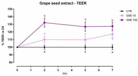 TEER of Caco-2 cells cultured with 10 or 100 ppm of grape seed extract. Data in the graph are represented as means (n = 6) ± SEM. Different letters indicate statistical significance with p < 0.05. TEER = transepithelial electrical resistance (Ω·cm2).