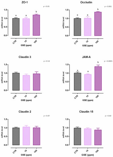 Data obtained from the viability assay reported a significant reduction after 24 h of treatment with 200 ppm of extract. Data were confirmed after 7 days, as 100 ppm caused a 10% reduction of viability (Figure S3). Concerning TEER, cells treated with GSE 100 ppm showed an increase of TEER compared to the control, starting from day 2 (Figure 7). Moreover, the addition of 10 ppm revealed an increase of TEER on day 7. Results of gene expression are described in Figure 8. Compared to the control, mRNA level of ZO-1, occludin, and JAM-A were significantly increased by the treatments (p < 0.05, p < 0.001, and p < 0.0005, respectively). No differences were reported for claudins.