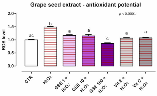 After 24 h of incubation with the different dosages of GSE (1, 10, 100 ppm), no variations in ROS productions were reported (data not shown). Moreover, when cells were challenged with H2O2 for 60 min, the preventive treatment with 1 ppm of GSE significantly ameliorate the amounts of ROS compared to the positive control, maintaining the same level of ROS as the unchallenged group (Figure 9). In fact, all of the doses of GSE allowed a restorative effect against the challenge of the ROS-inducer, with results comparable to vitamin C and vitamin E.