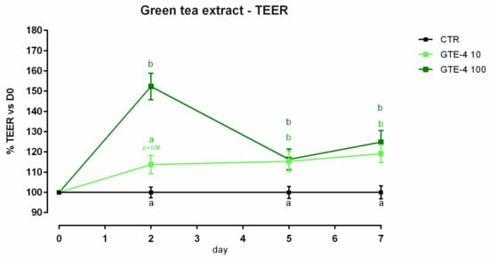 TEER of Caco-2 cells cultured with 10 or 100 ppm of green tea extract. Data in the graph are represented as as means (n = 6) ± SEM. Different letters indicate statistical significance with p < 0.05. TEER = transepithelial electrical resistance (Ω·cm2).