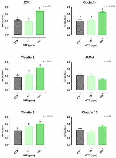 No significant variation of viability was reported in cells treated with GTE (Figure S4). Concerning TEER, cells treated with GTE 100 ppm showed a peak of increment in TEER compared to the control, starting from day 2 (Figure 10). Treatment with 10 ppm of GTE allows a slow increase of TEER, with a tendency at day 2 (p = 0.06 compared to the control); this increment becomes comparable to GTE 100 on days 5 and 7. Results regarding gene expression are reported in Figure 11. Compared to the control, mRNA levels of ZO-1, occludin, claudin 2, and claudin 3 were significantly increased by the treatments (p < 0.005). No differences were reported for claudin 15 and JAM-A.
