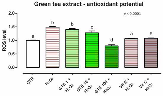 Effects of green tea extract on intracellular ROS production: ROS level of Caco-2 cells treated with 1, 10, or 100 ppm of GTE and challenged with 500 μM of hydrogen peroxide (H2O2) for 60 min. ROS production was assessed by CellROX® deep red reagent assay and expressed as fluorescence intensity calculated relative to the control group. Values in the graph are means (n = 6) ± SEM. Different letters indicate statistical significance with p < 0.05. 500 μM of hydrogen peroxide (H2O2) was used as a positive control. Vitamin E (Vit E) and vitamin C (Vit C) were used as a standard of antioxidant potential.