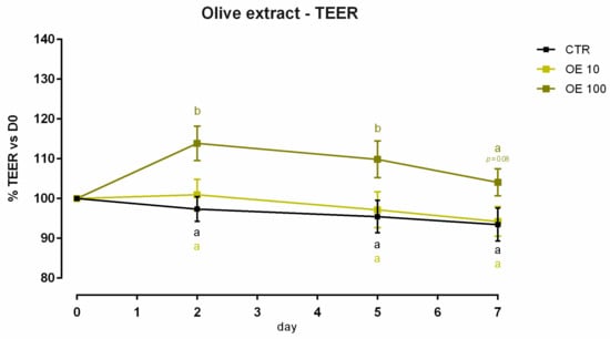 TEER of Caco-2 cells cultured with 10 or 100 ppm of olive extract. Data in the graph are represented as means (n = 6) ± SEM. Different letters indicate statistical significance with p < 0.05. TEER = transepithelial electrical resistance (Ω·cm2).