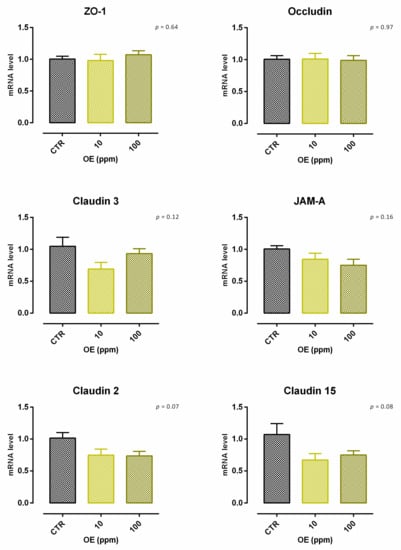 A significant reduction (about 6%) in viability was reported with 10 ppm of OE after 24 h of treatment, and data were consistent after 7 days of treatment (Figure S5). Concerning TEER, 100 ppm of OE significantly increased the electrical resistance on days 2 and 5 of treatment, while a reduction was reported at the end of the experiment, with a tendency of increment (p = 0.06). Compared to the control, no variation was reported for cells with 10 ppm of OE (Figure 13). Results regarding gene expression are consistent with TEER, as reported in Figure 14. In fact, no significant variation in gene expression was reported. Also, a tendency for mRNA reduction was reported for claudin 2 and claudin 15 (p = 0.07 and p = 0.08, respectively).