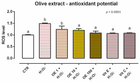 Effects of olive extract on intracellular ROS production: ROS level of Caco-2 cells treated with 1, 10, or 100 ppm of OE and challenged with 500 μM of hydrogen peroxide (H2O2) for 60 min. ROS production was assessed by CellROX® deep red reagent assay and expressed as fluorescence intensity calculated relative to the control group. Values in the graph are means (n = 6) ± SEM. Different letters indicate statistical significance with p < 0.05. 500 μM of hydrogen peroxide (H2O2) was used as a positive control. Vitamin E (Vit E) and vitamin C (Vit C) were used as a standard of antioxidant potential.