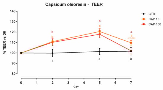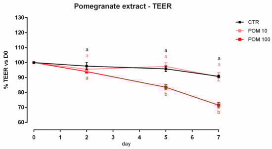 TEER of Caco-2 cells cultured with 10 or 100 ppm of pomegranate extract. Data in the graph are represented as means (n = 6) ± SEM. Different letters indicate statistical significance with p < 0.05. TEER = transepithelial electrical resistance (Ω·cm2).