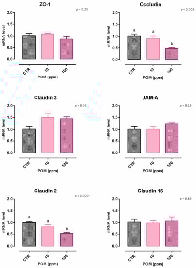 After 7 days, a significant reduction of viability was reported, starting from 100 ppm of inclusion (Figure S6). Concerning the dose response, 100 ppm of TTO negatively impacted the TEER after 5 days of the treatment, compared to the control, and the lower dosage of inclusion (Figure 16). Results regarding gene expression are reported in Figure 17. Compared to the control, the mRNA level of occludin was significantly reduced by the supplementation of 100 ppm of POM (p < 0.005), supporting the data obtained from TEER. Also, claudin 2 was negatively impacted by the inclusion of 100 ppm of POM (p < 0.0005). No differences were reported for ZO-1, JAM-A, and claudin 15, while a positive tendency was registered for claudin 3 (p = 0.06).