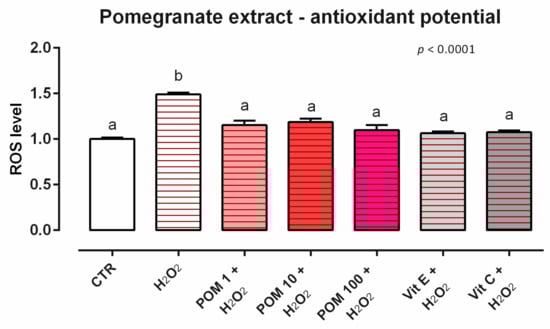 Effects of pomegranate extract on intracellular ROS production: ROS level of Caco-2 cells treated with 1, 10, or 100 ppm of POM and challenged with 500 μM of hydrogen peroxide (H2O2) for 60 min. ROS production was assessed by CellROX® deep red reagent assay and expressed as fluorescence intensity calculated relative to the control group. VAlues in the graph are means (n = 6) ± SEM represented by vertical bars. Different letters indicate statistical significance with p < 0.05. 500 μM of hydrogen peroxide (H2O2) was used as a positive control. Vitamin E (Vit E) and vitamin C (Vit C) were used as a standard of antioxidant potential.
