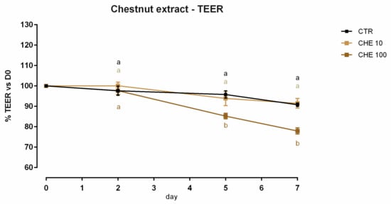 TEER of Caco-2 cells cultured with 10 or 100 ppm of chestnut extract. Data in the graph are represented as means (n = 6) ± SEM. Different letters indicate statistical significance with p < 0.05. TEER = transepithelial electrical resistance (Ω·cm2).