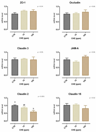 A slight but significant reduction (about 3%) of viability was reported with 1 ppm of CHE after 7 days of treatment; the reduction of viability for 10–100–200 ppm did not reach 10% (Figure S7). Concerning TEER, 100 ppm of CHE caused a significant decrease of the electrical resistance on days 5 and 7 of treatment, compared to the control and CHE 10. Compared to the control, no variation was reported for cells with 10 ppm of CHE (Figure 19). The results of gene expression are reported in Figure 20. No significant variation in gene expression was reported, with the exception of a reduction of claudin 2 (p < 0.001). A positive tendency was registered for JAM-A (p = 0.06).