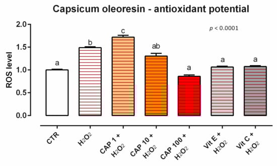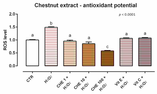 After 24 h of incubation, OE induces ROS production for the concentrations tested (data not shown). When cells were challenged with H2O2 for 60 min (ROS-production challenge, positive control), the treatments with 10 and 100 ppm of OE allowed for a significant reduction of ROS concentration compared to the positive control, maintaining the same level of ROS as the unchallenged group and vitamins (internal controls) (Figure 15).