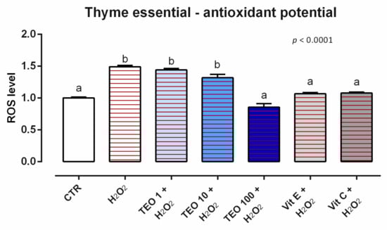 As concerns the ROS levels, 24 h of incubation with TTO induces ROS production in Caco-2 cells at the tested concentrations (data not shown). When cells were subjected to a challenge with 500 µM of H2O2, the addition of TTO positively impacted the ROS production, with a reduction of cells treated with 10 and 100 ppm of TTO compared to the positive control. The reduction of ROS obtained with TTO was comparable to the ones obtained with vitamins, which are used as internal controls (Figure 6).