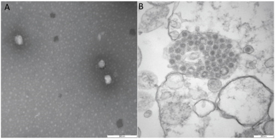 (A) Electron micrograph of purified isolate negatively stained with 2% phosphotungstic acid. (B) Ultra-thin sections of infected VERO-E6 cells displaying typical viral particles, organized as paracrystalline structures within cytosol. Scale bar, 200 nm.