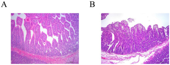 Pathology of jejunum villi of piglet samples: (A) control and (B) diseased piglets.
