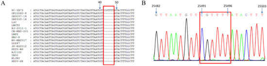 Multiple sequence alignment of E gene of PEDV strains (A) and partial-Sanger-sequencing peak map for SC-YB73 (B). The red box was present the six nucleotide acid insertions.