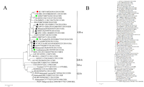 Phylogenetic analyses of complete sequence (A) and spike sequence (B) regions of SC-YB73 and most closely related strains in GenBank for which whole genome sequences were available. Neighbor joining was used for the construction of the phylogenetic tree with 1000 bootstrap replicates shown at branches. Scale bar represents p-distance. Red circle represents isolated strain in this study. Green circles represent possible recombinant strains. Black triangles represent US-PEDV-S-INDEL-variant-like strains. Black squares represent US PEDV prototype-like strains. CHN, China; USA, United States of America; GER, Germany; BEL, Belgium; COL, Columbia; KR, Republic of Korea; MEX, Mexico; FRA, France; ITA, Italy.