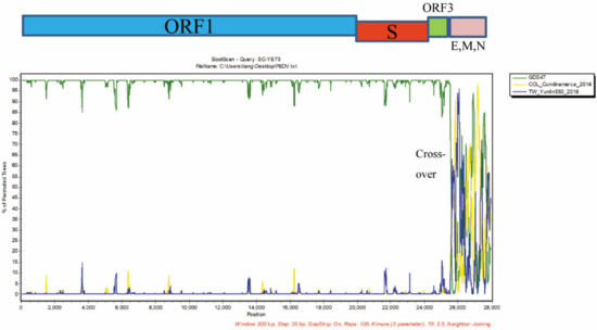 Recombination analysis of PEDV strains. Crossover region in SC-YB73 genome was detected with Simplot v3.5.1. Y-axis shows percentage of permuted trees employing a sliding window of 200 nucleotides (nt) and step size of 20 nt. Other parameters used included Kimura (2-parameter) distance model, 2.0 Ts/Tv ratio, neighbor-joining tree model, and 1000 bootstrap replicates. COL/Cundinamarca/2014:KU569509/2014/COL; GDS47:MH726382/2016/CHN; TW/Yunlin550/2018:MK673545/2019/CHN.