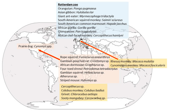Species that have been found to be positive, either by virus isolation or presence of antibodies, and area of origin. Rodents are written in pink boxes; non-human primates in orange boxes and the species that were affected at the Rotterdam Zoo in a blue box.