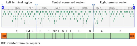 The genome structure is challenging. There are three main reasons for this: (a) it has a 6.5 kb inverted terminal repeats (ITR) at each end hard to resolve into individual copies with short read approaches, (b) it has a low G/C content and high poly A/T homopolymeric tracts that are hard to sequence accurately, and (c) there are local tandem repeats scattered across the genome [39,40].