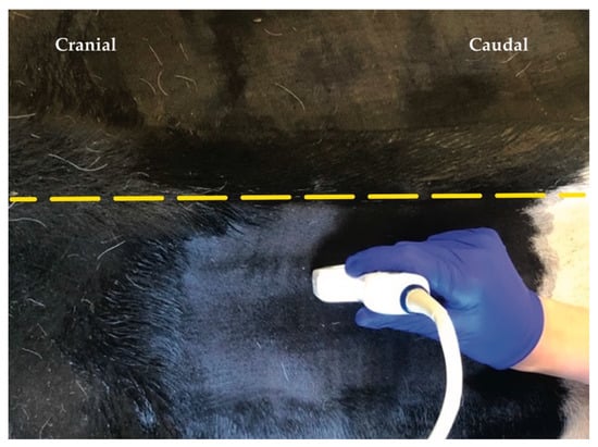 Position of the ultrasound probe parasagittally from dorsal midline (yellow dashed line).