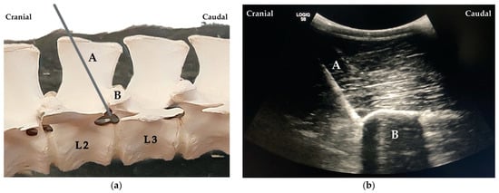 (a) Needle (A) placement cranial to the articular process of the second lumbar (L2) vertebra (B). (b) Ultrasound image showing the needle (A) cranially to the articular process of the vertebra L2 (B).