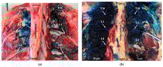 The dorsal roots of spinal nerves T13-L2 were visualized, and the spreading of the dye along the nerves as well as the vertebral column could be measured. The anatomical specimens were turned to the ventral side where connective and adipose tissues, as well the M. psoas major were removed to visualize the ventral roots of T13-L2. The same measurements were performed for the ventral aspect. To finalize the observation of dye spreading, a median section of the vertebral column along the Processus spinosi was conducted using an electric saw (K440H, Kolbe GmbH—Foodtech, Elchingen, Germany). The medulla spinalis from T13-L4 was observed, and the spread of the dye in the Canalis vertebralis, dorsal roots, their Ganglion spinale and Dura mater was recorded for the left and right antimeres. Additionally, the Ligamentum lumbocostalis at T13 and the Ligamentum intertransversarium at L1 and L2 were also observed for dye spreading.