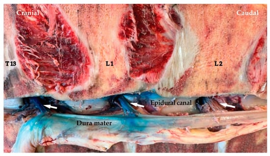 In cattle, pain management relies on a restrained legal choice of drugs and a balance between the economic constraints of the production enterprise and the need to mitigate discomfort []. One of the most common surgical procedures performed in cattle is abdominal surgery [,]. Abdominal procedures are routinely performed with the animal standing using locoregional anaesthesia []. Locoregional anaesthesia allows standing surgical procedures in cattle with minimal physical and chemical restraints []. To provide local anaesthesia and analgesia to the flank regions, many techniques have been described: infiltration line block and inverted L-block, paravertebral nerve block (proximal and distal), segmental subarachnoid and high caudal epidural anaesthesia [,,,].