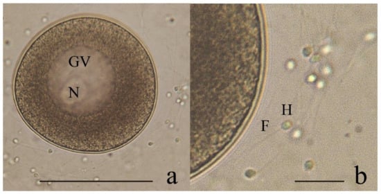 Oocyte and sperm of the surf clam Mesodesma donacium obtained by the stripping technique seen under a microscope. (a) Oocyte with germinal vesicle (GV) and nucleus (N), scale bar 50 μm; (b) sperm where the head (H) and flagellum (F) are observed (scale bar = 10 μm).
