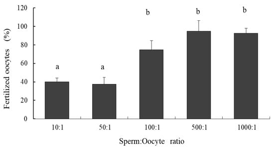 The five sperm:oocyte ratio treatments showed significant differences in fertilization percentage (one-way ANOVA, df = 35, F = 27.75, p < 0.001). A Tukey’s a posteriori analysis (unequal N HSD) showed that the fertilization percentage ratios of 10:1 and 50:1 were significantly lower than the other sperm:oocyte ratios (≥100:1 sperm:oocyte ratio) (Figure 2). Treatments with the highest ratio of sperm per oocyte showed the lowest percentages of unfertilized oocytes. The presence of oocytes in lysis was observed in one replicate of the treatment with a ratio of 1000:1 sperm:oocyte.
