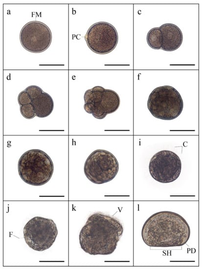 Embryonic development of the surf clam Mesodesma donacium at 16 °C: (a) oocyte with fertilization membrane (FM); (b) release of first polar corpuscle (PC); (c) first two-cell embryo segmentation (2 blastomeres); (d) second segmentation (4 cells); (e) third segmentation (8 cells); (f) morula; (g) blastula; (h) rotary blastula; (i) gastrula with cilia (C); (j) trochophore larva with apical flagellum (F); (k) trochophore larva with extended vellum (V); (l) D larva with straight hinge (SH) and prodisoconch I (PD). Scale bar = 50 μm.