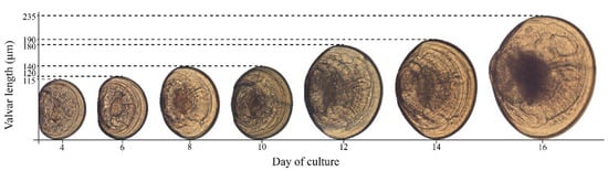 The same temperature treatments used in embryonic development in triplicate were used for larval development (from D larvae to umbonate larvae). For larval culture, an initial density of 4 larvae per mL was used with the seawater filtered (1 μm) and water exchanged every other day. The larvae were maintained through mixed feeding with microalgae (flagellates and diatoms) at a concentration of 20,000 cel/mL−1 [], and growth rate and survival were evaluated by taking subsamples of 1 mL.
