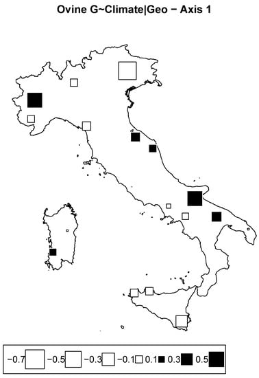 3.3.2. Redundancy Analysis According to Climate Conditioned for Geography in Sheep