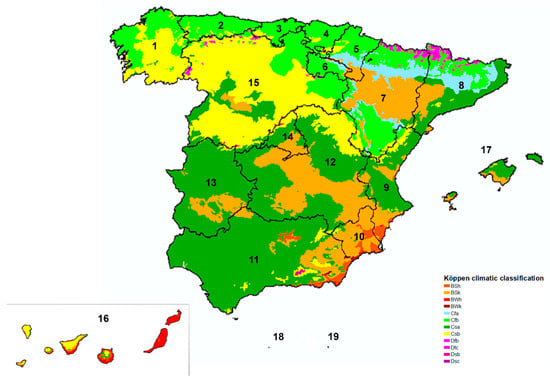 Map with the main climates present in Spain (Köppen Climate Classification System). The numbers correspond to the autonomous communities and autonomous cities, as described in Table 1. Abbreviations: BSh: hot semi-arid climate (steppe); BSk: cold steppe climate; BWh: desert climate; BWk: Cold desert climate; Cfa: humid subtropical climate; Cfb: oceanic climate; Csa: hot-summer Mediterranean climate; Csb: warm-summer Mediterranean climate; Dfb: humid continental climate; Dfc: subarctic climate; Dsb: humid continental climate; Dsc: subarctic climate.