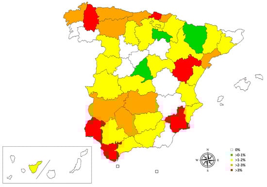Spain is located in the south of Western Europe and next to North Africa, with an area of 505,370 km², being the fourth largest country in continental Europe, after Russia, Ukraine, and France [24]. Spain is organized into seventeen autonomous communities—with a total of fifty provinces—and two autonomous cities. Fifteen autonomous communities are located on the Iberian Peninsula, while the other two, made up of islands, are located in the western Mediterranean Sea (Balearic Islands) and in the Atlantic Ocean close to the northwest coast of Africa (Canary Islands). The autonomous cities (Ceuta and Melilla) are located in the north coast of the African continent, next to the Mediterranean Sea and bordering Morocco.