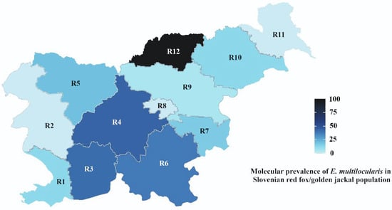 Molecular prevalence of E. multilocularis in the Slovenian red fox/golden jackal population (%). Regions (R): R1—obalno kraska, R2—goriska, R3—primorsko notranjska, R4—osrednjeslovenska, R5—gorenjska, R6— jugovzhodna Slovenija, R7—posavska, R8—zasavska, R9—savinjska, R10—podravska, R11—pomurska, R12—koroska.