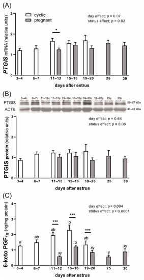 Expression of prostaglandin I2 (PGI2; prostacyclin) synthase (PTGIS) mRNA (A) and protein (B) and concentrations of 6-keto PGF1α (a PGI2 metabolite; C) in the myometrium of cyclic and early pregnant gilts. Values from real-time PCR for PTGIS were normalized to geometric averaging of GAPDH and HPRT1 gene expression. Values from densitometric analyses of PTGIS protein were normalized to ACTB. Representative blots are presented (c—cyclic, p—pregnant; original western blots are included in Figure S1). Data are expressed as the mean ± SEM (n = 5–7). Bars marked with various letters (ab—for cyclic gilts; xy—for pregnant gilts) are different among groups. Asterisks specify differences between cyclic and pregnant animals on particular days after estrus (* p < 0.05; *** p < 0.001).