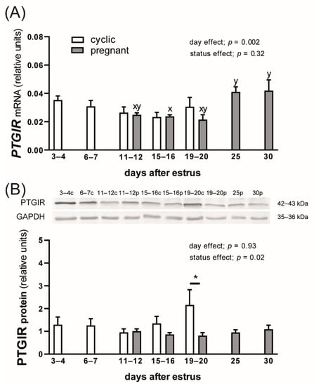 Prostaglandin I2 receptor (PTGIR) mRNA (A) and protein (B) expression in the myometrium of cyclic and early pregnant gilts. Values from real-time PCR for PTGIR were normalized to geometric averaging of GAPDH and HPRT1 gene expression. Values from densitometric analyses of PTGIR protein were normalized to GAPDH. Representative blots are presented (c—cyclic, p—pregnant; original western blots are included in Figure S1). Data are expressed as the mean ± SEM (n = 5–7). Bars marked with various letters are different among the group of pregnant females. Asterisk specifies the difference between cyclic and pregnant animals on days 19–20 after estrus (* p < 0.05).