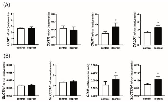 The treatment of myometrial explants with iloprost increased the mRNA expression of CNN1 and CALD1 (p < 0.05) but did not affect the relative abundance of GJA1 and OXTR transcripts (Figure 3A). Among nutrient transporter encoding genes, iloprost stimulated the mRNA expression of CD36 and SLC27A4 (p < 0.05), while the expression of SLC5A1 and SLC38A1 mRNA did not differ between control and iloprost-treated myometrial explants (Figure 3B).