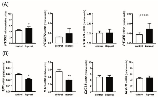 As shown in Figure 4A, the addition of iloprost to the incubation medium resulted in a greater expression of PTGS2 mRNA (p < 0.05) and tended to increase PTGFR mRNA expression (p = 0.06). The relative abundance of PTGER2 and PTGER4 transcripts were not affected by the presence of iloprost. Among inflammatory response-related genes, iloprost decreased TNF and IL1B mRNA expression (p < 0.05 and p < 0.01, respectively) and had no effect on CXCL8 and NFKB1 mRNA expression (Figure 4B).